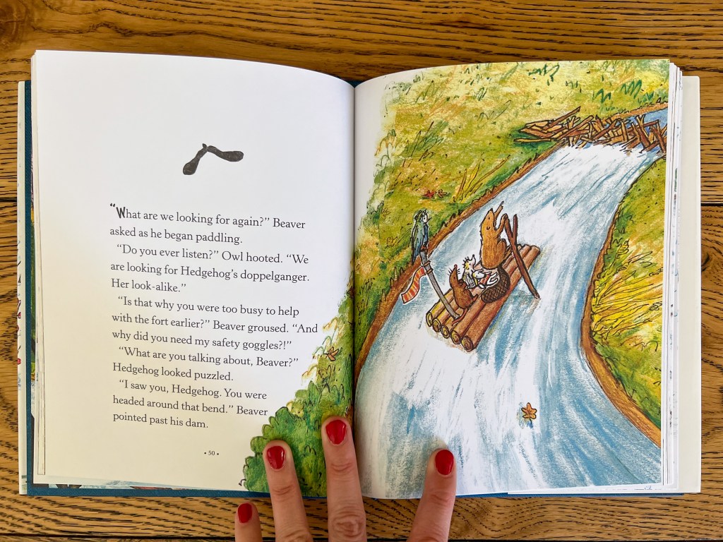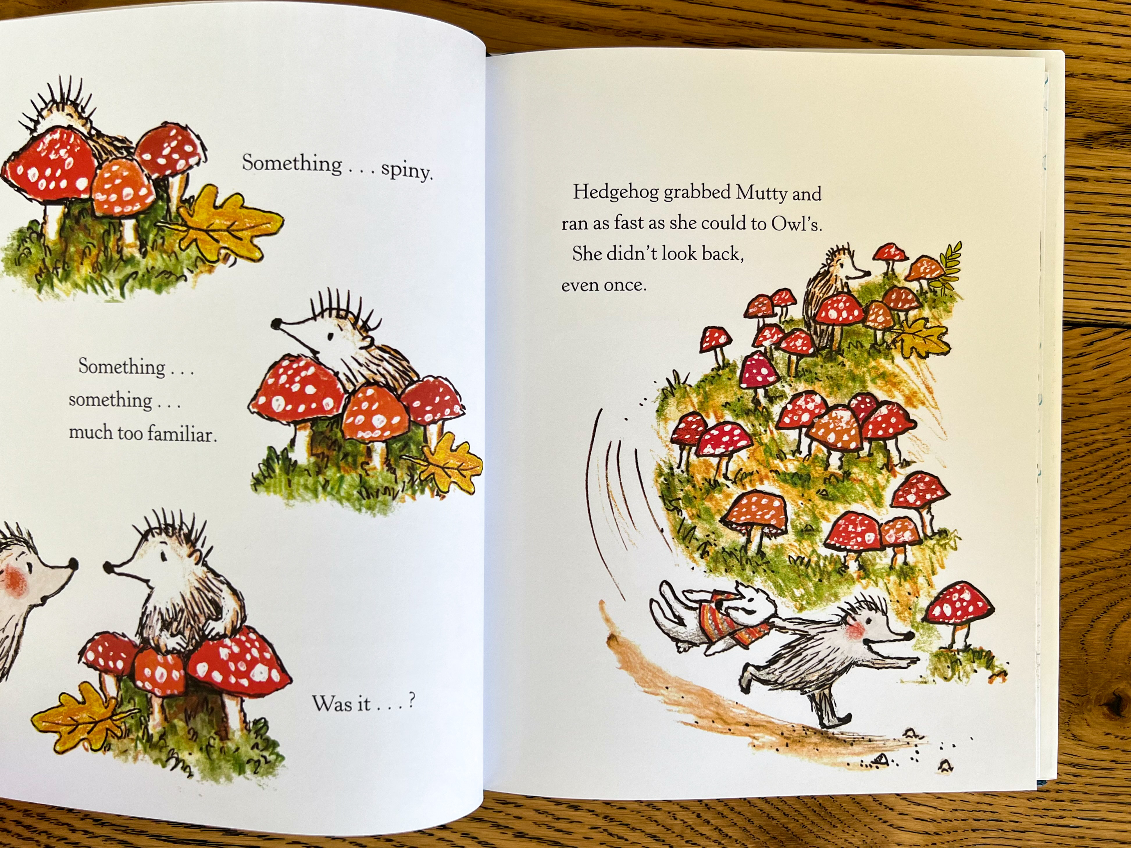 The change in seasons is in the air, which means some of the forest friends will be hibernating soon, but Hedgehog is trying not to think about that, as she heads to Owl’s for storytime (“today is new-book day, today is new-book day!”). Along the way, she encounters a creature that looks…exactly like her?! A crisis of confidence ensues: is there room in her forest of friends for another hedgehog? Everyone has an opinion, but it’s Hedgehog who’s going to have to muster up the courage to make up her own mind. (“I’m exhausted just thinking about it.”)