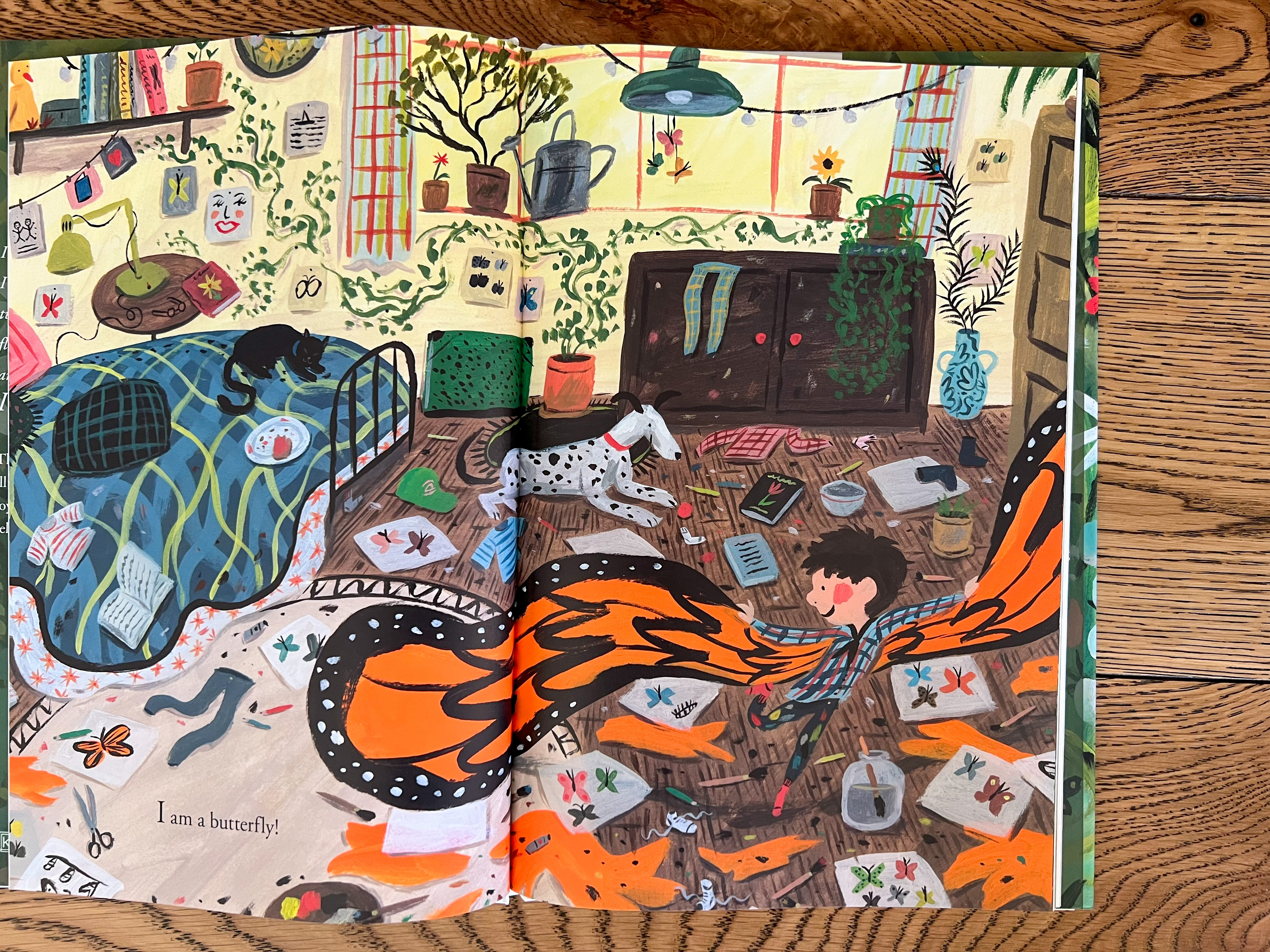 Exuberance reigns, as a child who presents as a boy handcrafts bold orange and black butterfly wings, complete with peacock feathers for antennae, and sets out the front door, “spinning and swirling,” “fluttering and flapping.” But a red ball, intentionally thrown by a group of teasing schoolkids, hits the child squarely in the forehead (“not these kids again”). The wings are tugged and torn by the other children, and the child abandons them on the ground and retreats home, presumably a familiar pattern (“I’d rather stay home anyway”).
