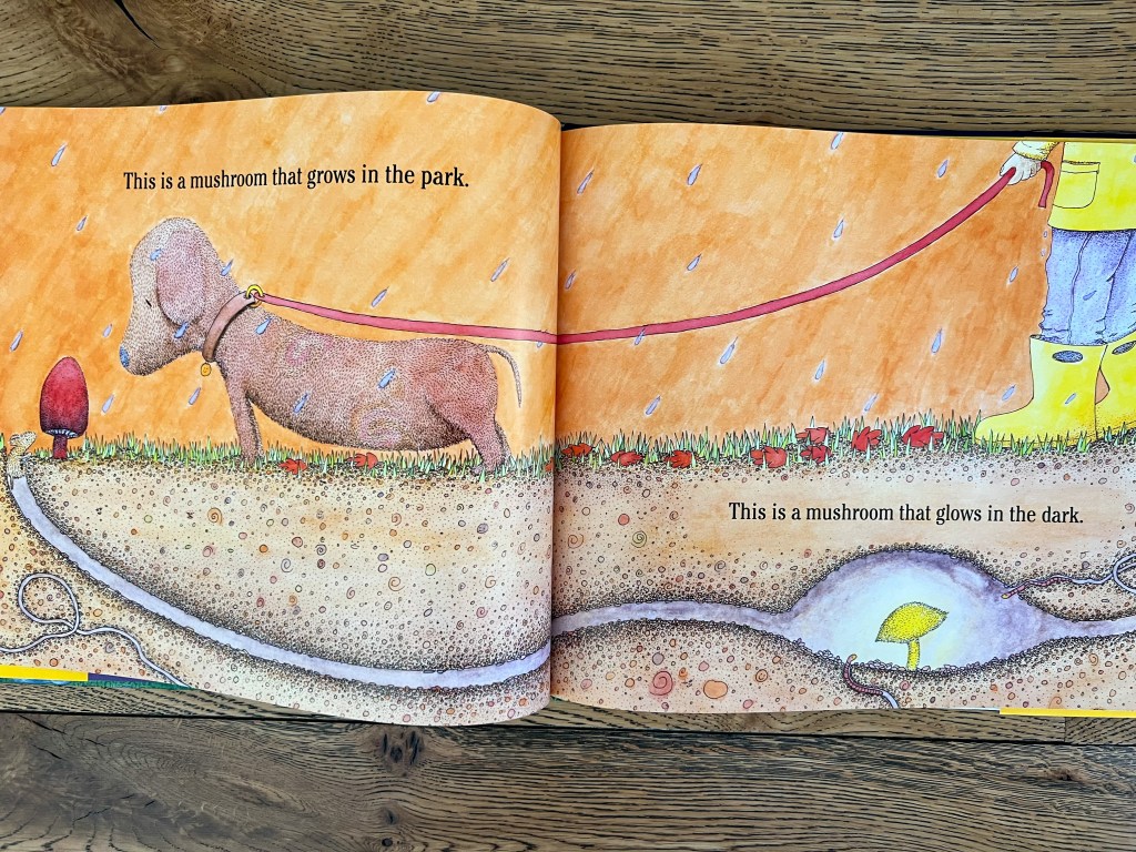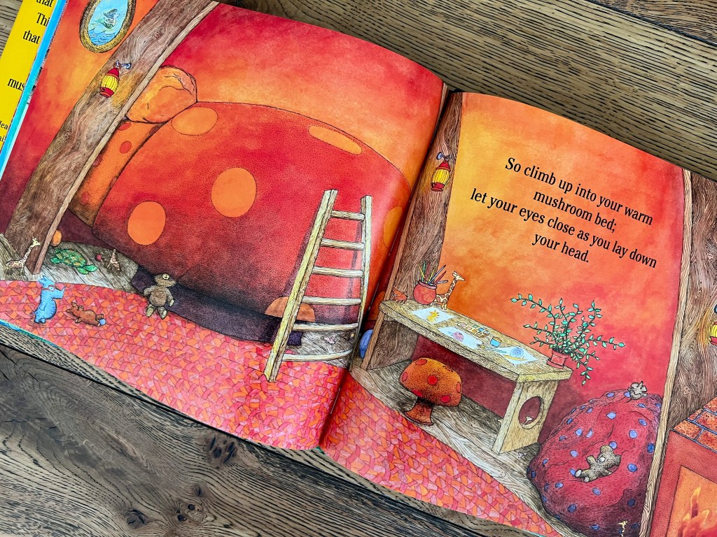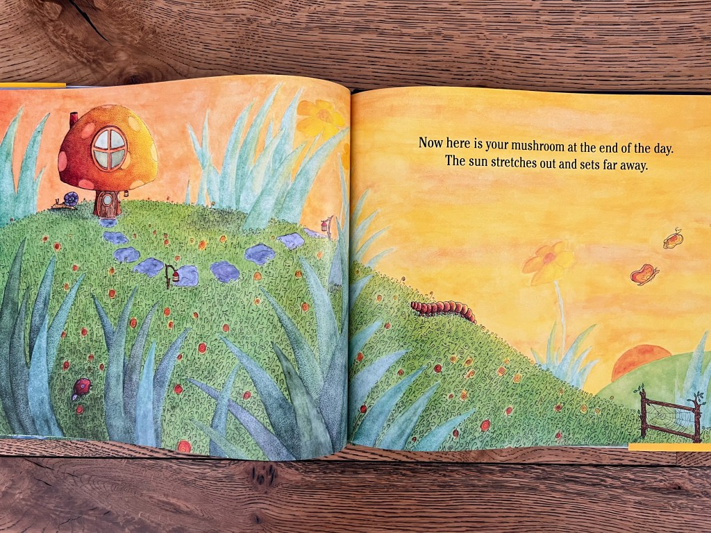 The book begins with an ode to mushrooms—the ones that grow in the park, the ones that grow in the dark—before landing on “a mushroom made just for you. Your friends can come too…” Sitting in the shade and drinking lemonade with pals in the grass outside your mushroom house is grand, but it’s even sweeter when the sun begins to set and you “head up your soft mushroom stair and read a book in your big mushroom chair.”