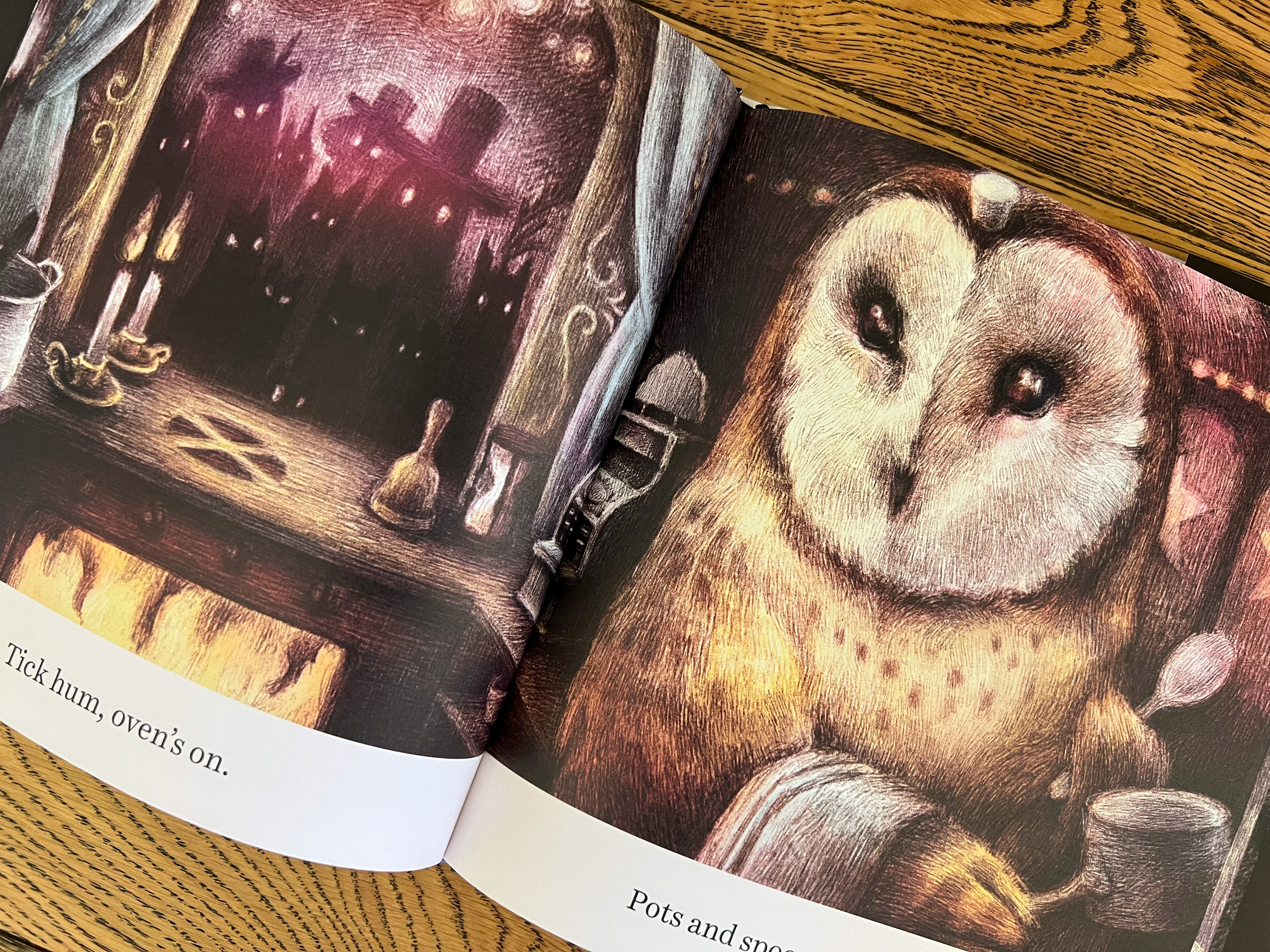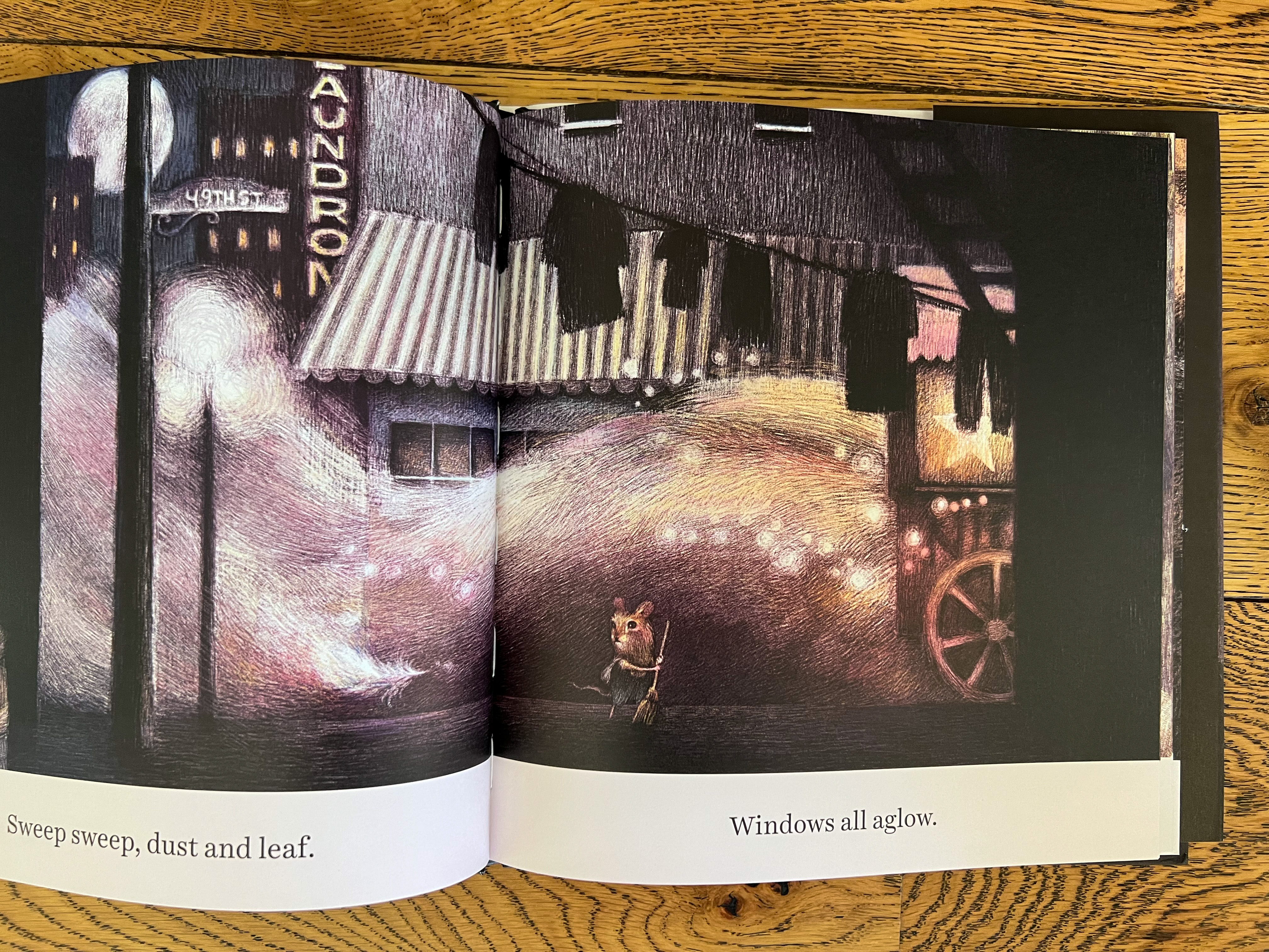 But what about the poor mouse below the wagon, hard at work sweeping the streets, pausing only to devour a crumb or look for pennies dropped in the gutter? When the night is through, will the mouse become the owl’s own tasty meal, or does the owl have something else in mind for the little street sweeper?