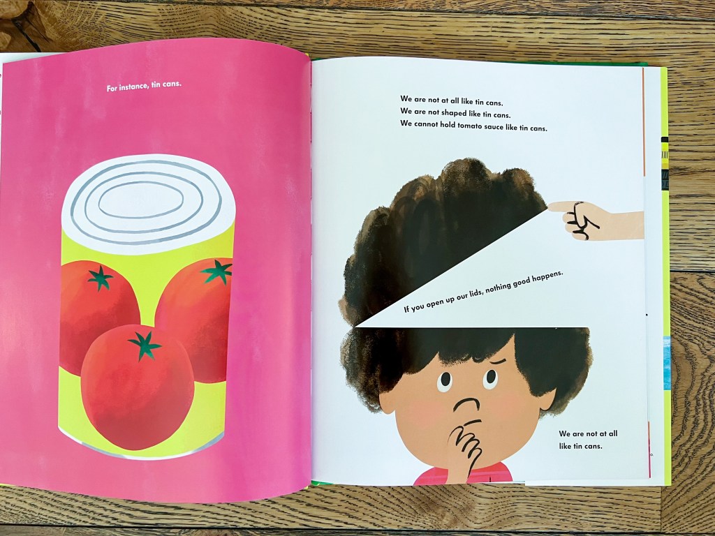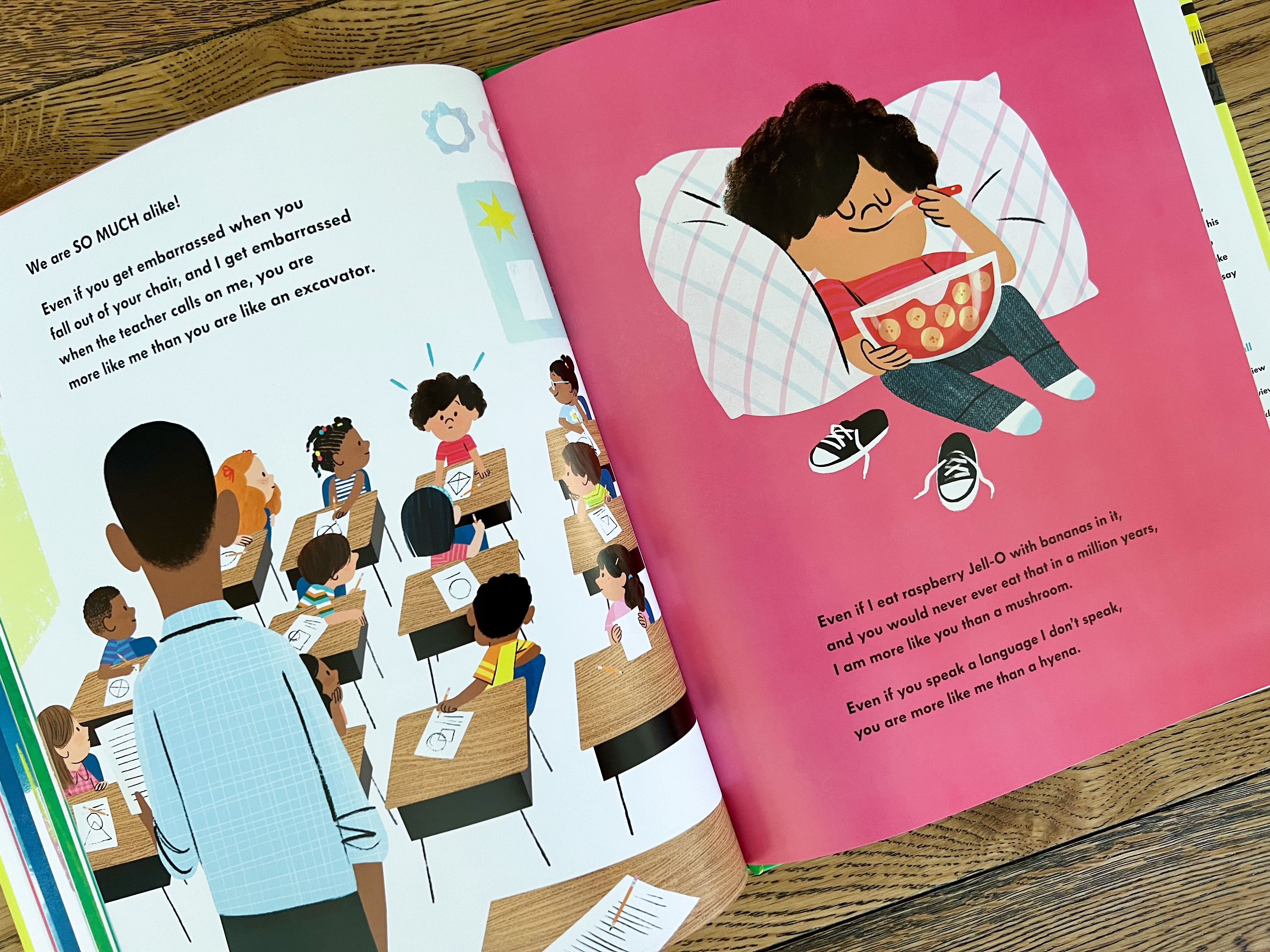 Through a series of surprising compare-and-contrast situations, our young narrator gets closer to landing on what makes humans human. We’re decidedly unlike tin cans (“if you open up our lids, nothing good happens”). We’re a little more like swimming pools, since we have water, chemicals, and dirt inside us, but we’re way more like a mushroom, which grows over time and makes baby mushrooms! Then again, hyenas have brains like we do, only they “don’t tell stories” or “get embarrassed, even when they’re caught eating something off the ground.”