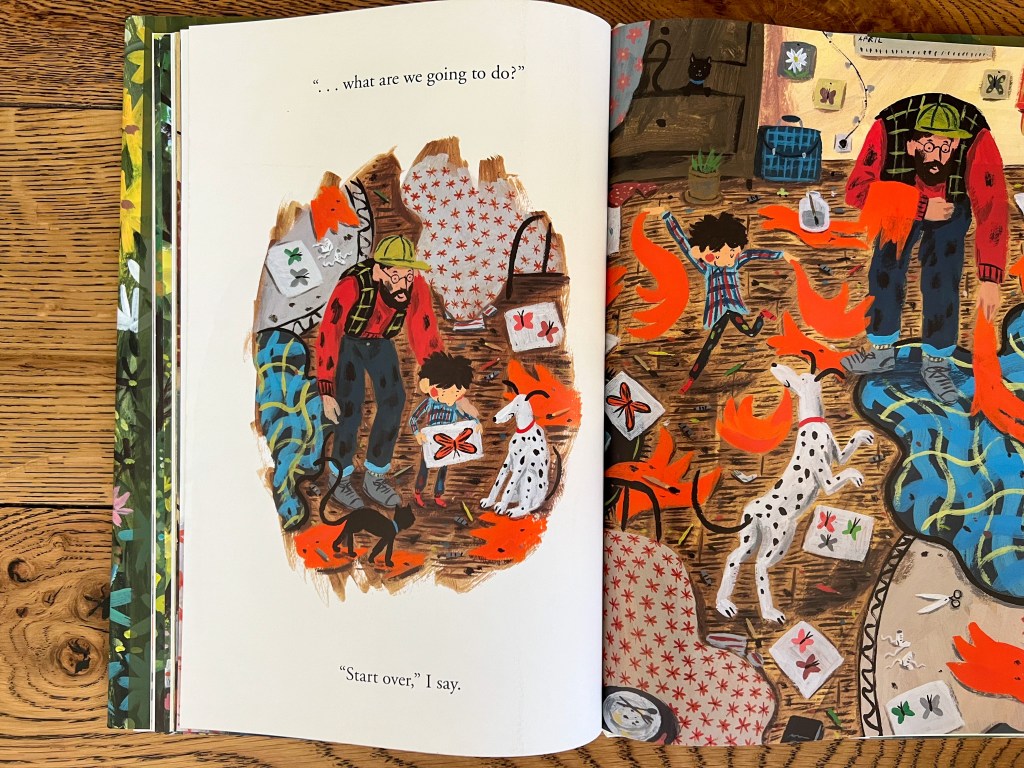 The child’s exit and re-entry has been observed by the child’s father, who bides his time before entering the child’s bedroom—itself a stunning array of creative output—with a plated snack. Papa’s display of love is quiet but sure, and after a long embrace, he restores agency to the child, who answers the father’s open-ended question about what to do next with a confident, “Start over.” And they do, working side by side to patch and paint, stitch and sew, until the Butterfly Child is crowned once again. But before the child tries for a do-over with the other children, Papa has just the fix. (Don’t you want to know what it is?)
