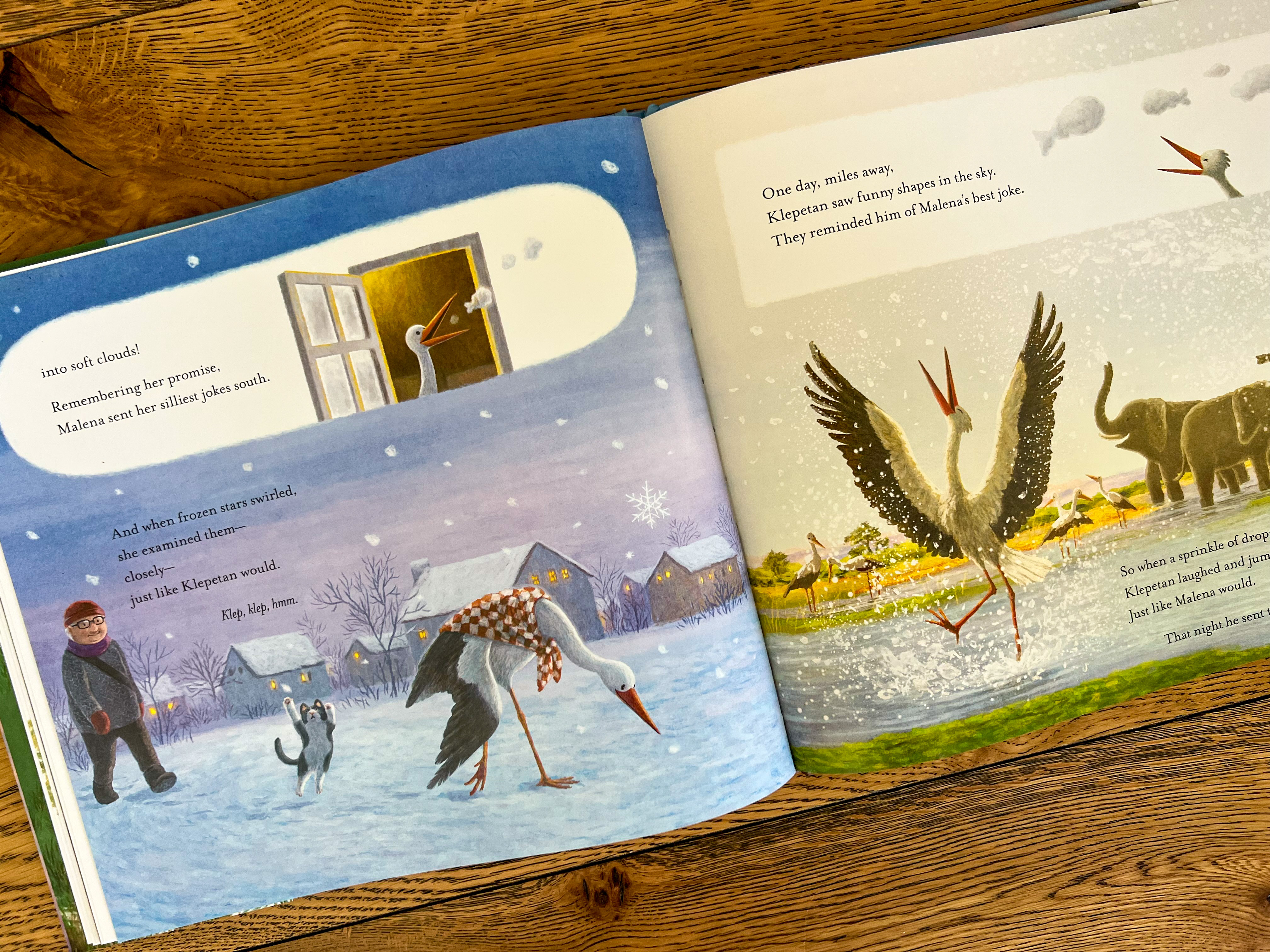 Malena adjusts to her winter in Croatia, getting to know a different side of the town and its people, while she sends love messages back to Klepetran through the puffs of clouds made by her breath in the snowy air. But when storks begin returning in the spring, Malena can’t spot Klepetran among them. Is it possible he won’t find his way back? (Spoiler alert: the real-life storks who inspired the story reunited every spring for a whopping NINETEEN years. Swoon.)