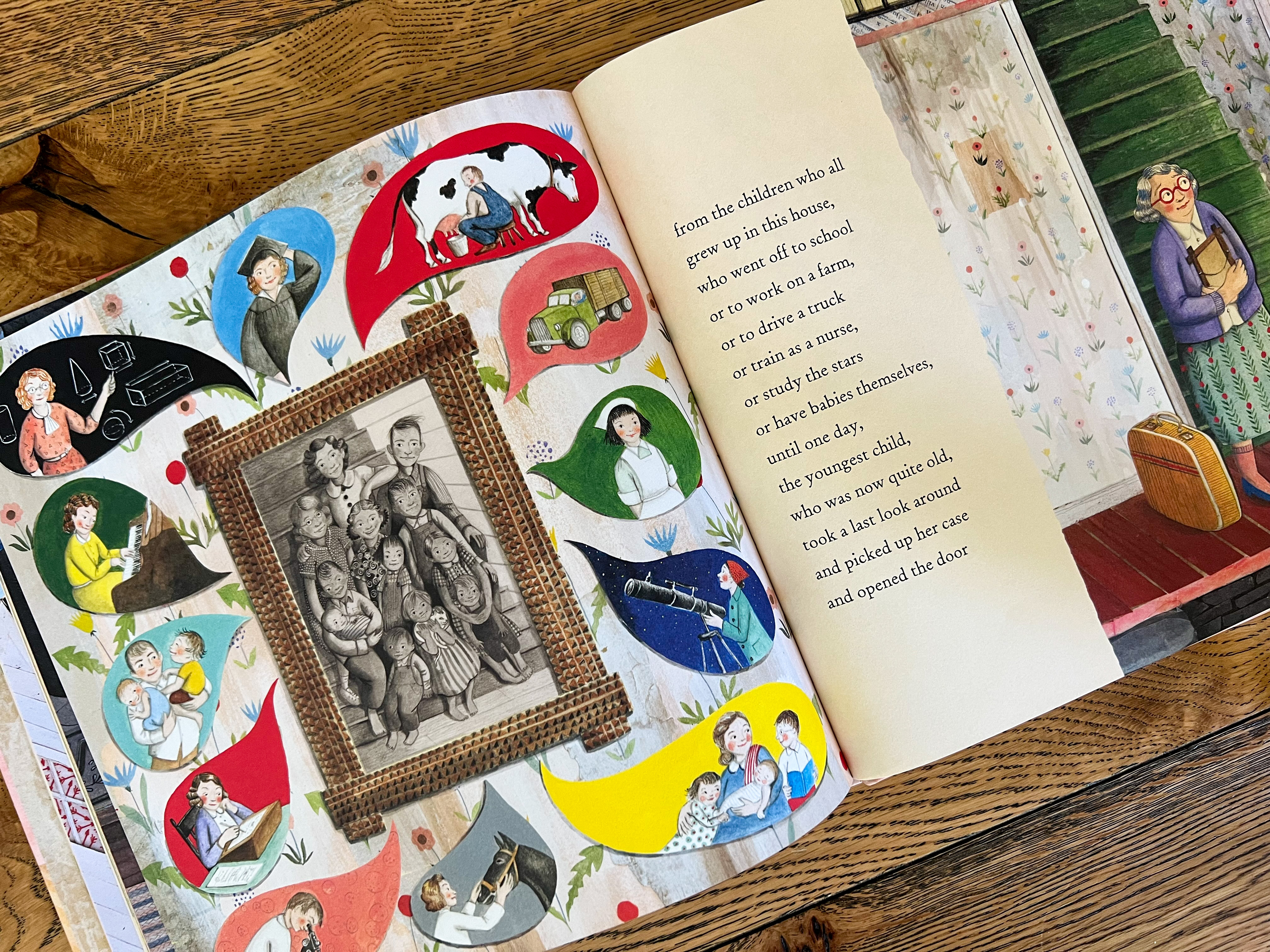 How does this two-time Caldecott medalist keep outdoing herself?! Sophie Blackall’s extraordinary artistry aside, I think the secret may be that she connects so personally with her subject matter. Nowhere is that more evident than in Farmhouse, a story born from a falling-down nineteenth-century farmhouse that Blackall discovered on her property in New York state. Before the house was demolished, she combed through its interior, imagining its long-ago inhabitants and scavenging scraps of wallpaper, curtains, newspaper, clothing, and handkerchiefs to tell their story. All these physical bits and pieces combine in delightful, surprising ways to become the book’s art, the backdrop against which a family of twelve children lives out their days.