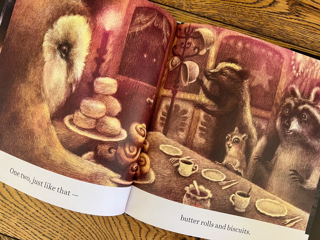 Crafted in a dark, dreamy, sepia-infused palette, Night Lunch is a magical ode to Victorian lunch wagons, precursors to today’s food trucks, starring an elegant horse drawn wagon that rolls into the city at midnight, ready to serve the nocturnal animals their lunch. An owl presides over the oven, as different animals approach the wagon to cozy up under its twinkling lights and feast off its porcelain plates. A mince pie for Fox; a sandwich for Badger; eggs over easy for a lunar moth; butter rolls and biscuits for the raccoons; and so on.