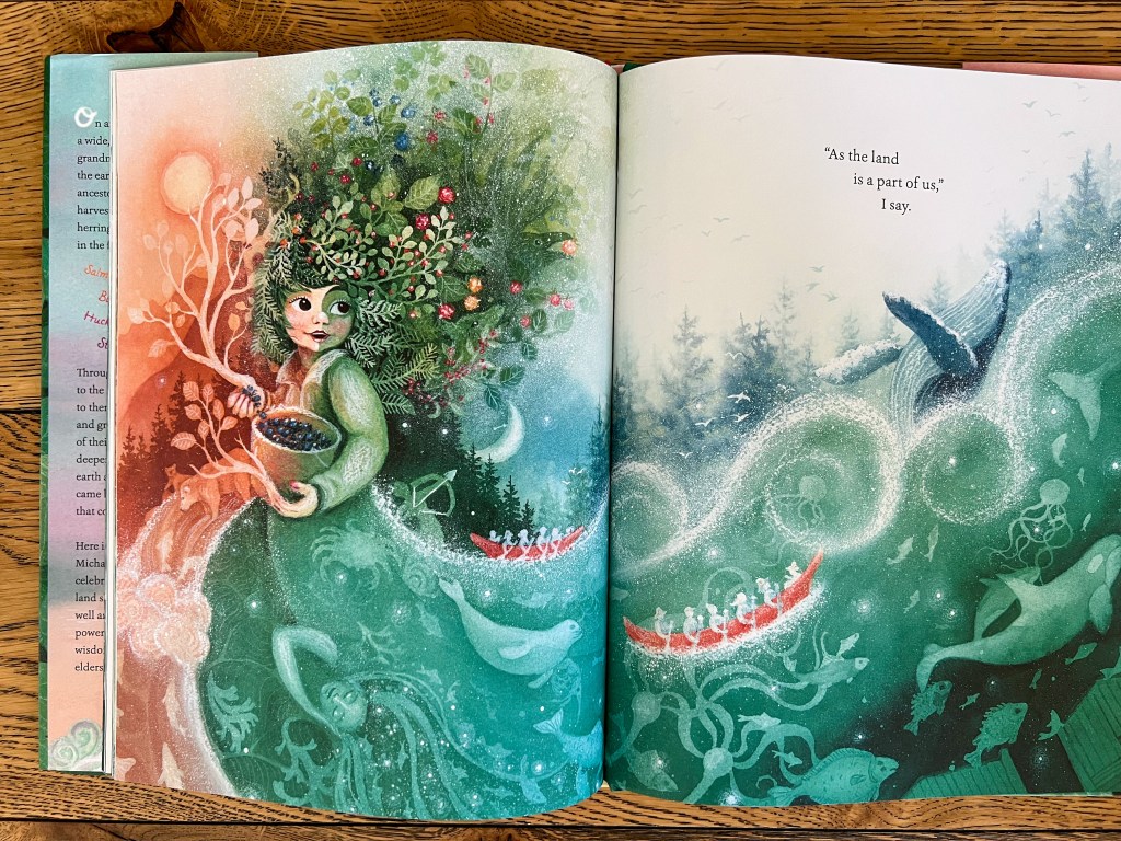 I knew Michaela Goade’s first self-authored picture book would be gorgeous—she’s a Caldecott Medalist, after all—but this book surpassed even my wildest expectations. Berry Song doesn’t just exhibit the reciprocity that the Tlingit people strive for in their relationship with the land, it invites us inside that relationship. In these evocative pages, we feel the fog settling over the boat, “the sweet smell of cedar and the tickle of moss,” the stain of a fresh-picked berry. We experience the affection and gratitude that a little girl and her grandmother show not just one another, but the flora and fauna around them. We feel the beauty, wonder, and thrill of the natural world, as few picture books allow.