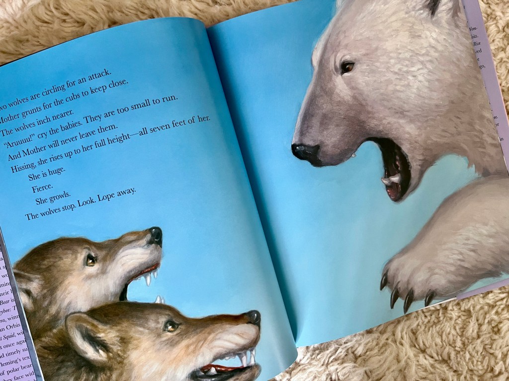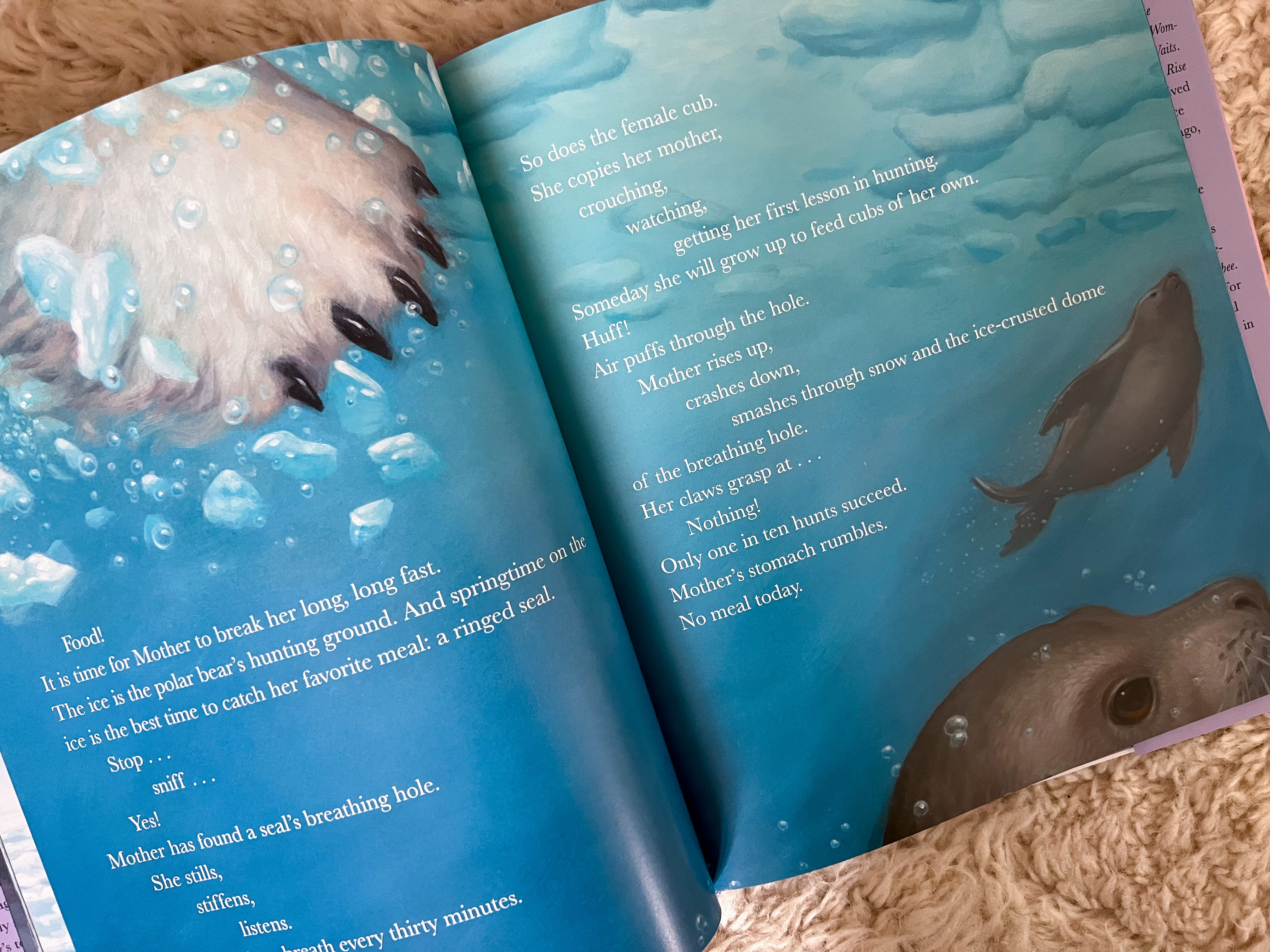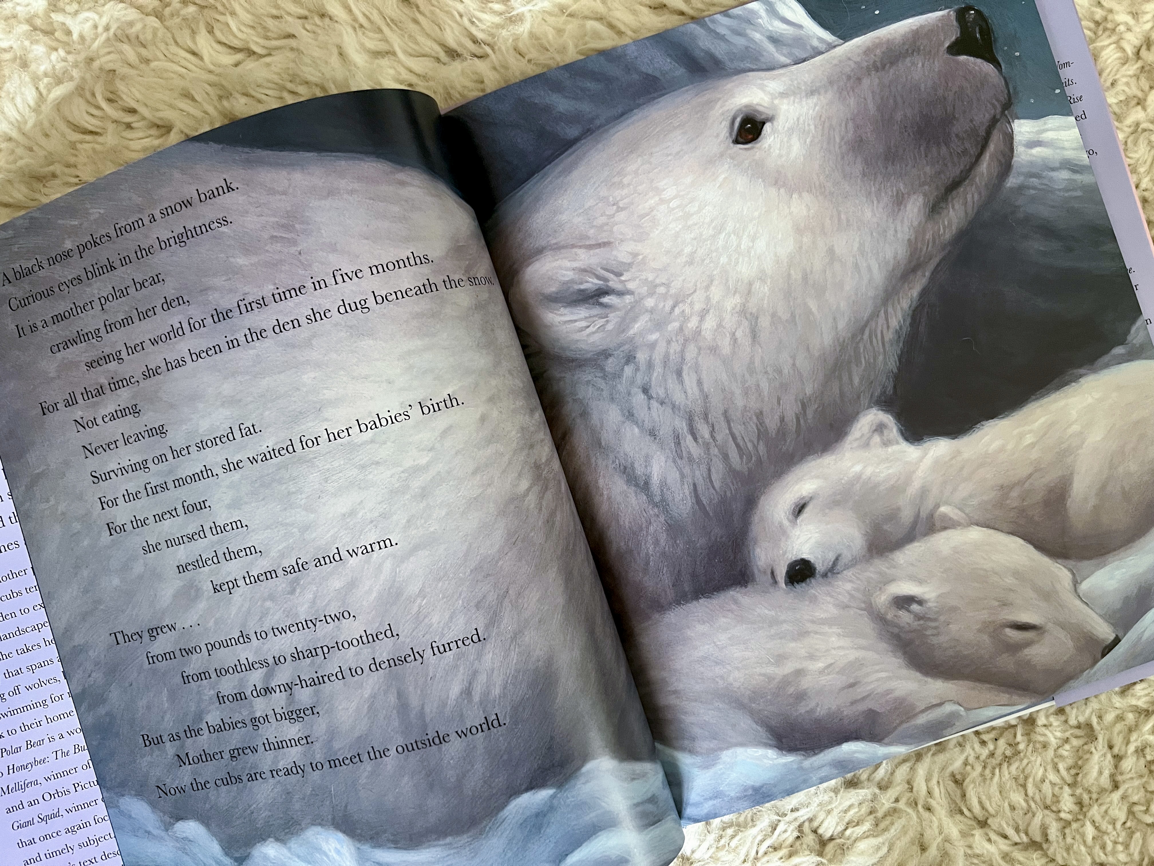 The book concludes with several pages of exceptional backmatter, addressing polar bear anatomy, the threats of climate change on polar bears’ habitats across the Arctic, and a myriad of fascinating factoids about this marvelous creature. A feast for young polar bear lovers and their caregivers—and the perfect book with which to hibernate away our own winter months.