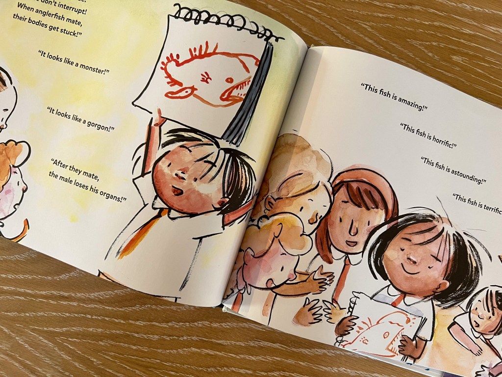 Then the magic happens. Agatha May’s classmates begin to interact with her, bubbling over with questions, which Agatha May patiently answers before commanding her audience to let her finish. Agatha May’s enthusiasm is contagious, and at the conclusion of her presentation, the children join her in affirming, “This fish is amazing!” “This fish is horrific!”