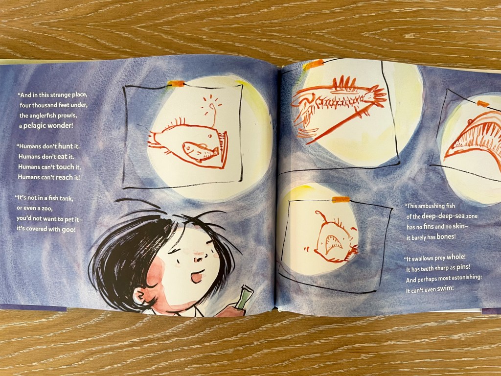 The emphasis of the story falls, not on Agatha May’s research, but on her delivery itself, which spans nearly half of the book. Agatha May positively shines while pontificating about her favorite subject in front of her classmates and teacher. She even cuts the lights, draws the curtains, and uses a flashlight on her face—a nod to the angler’s bioluminescence.