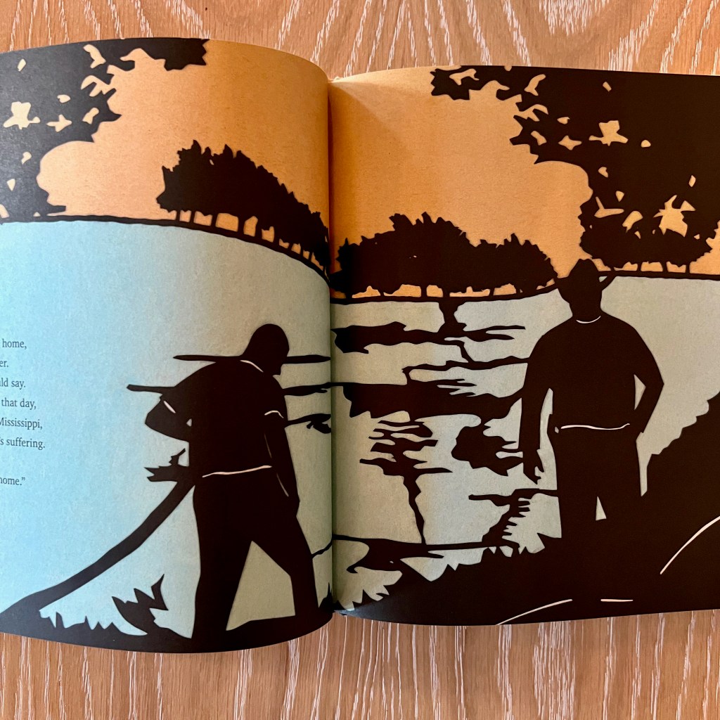 Let’s take a look at Choosing Brave, which clocks in at a whopping 64 pages and would deserve any accolades it receives next Monday, for words and art. Angela Joy’s evocative text, underscored with repetition, moves backwards and forward in time to tell a story of mother and son that’s much more than the tragedy at its heart. And Janelle Washington’s black cut-paper collages, notable for their silhouetted forms and strategically-placed pops of color, the latter created with tissue paper, assume an iconic, almost religious feel. (“I just had to pray and brave it,” Mamie Till Washington is quoted as saying in the book’s epigraph.) In fact, in a superior act of bookmaking, the pages themselves have a kind of waxy, glazy finish, giving the art the effect of stained glass in a church, at once confined and luminous.