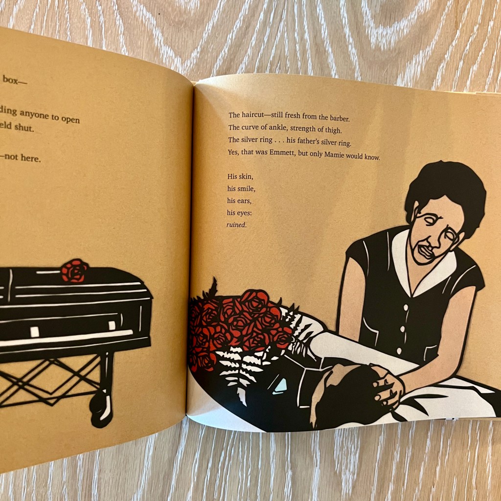 “The boy they found was far from home,/ far from Mother and Grandmother.” The book’s opening lines fall on August 31, 1955, when Emmett’s body was found “in the mud of Mississippi.” Though the details won’t come until later in the book, we are introduced immediately to the act that would shake the country. While a sheriff sought to dig the grave right there, “where no one would see the boy’s suffering,” Mamie said, “No. You send my son home.”