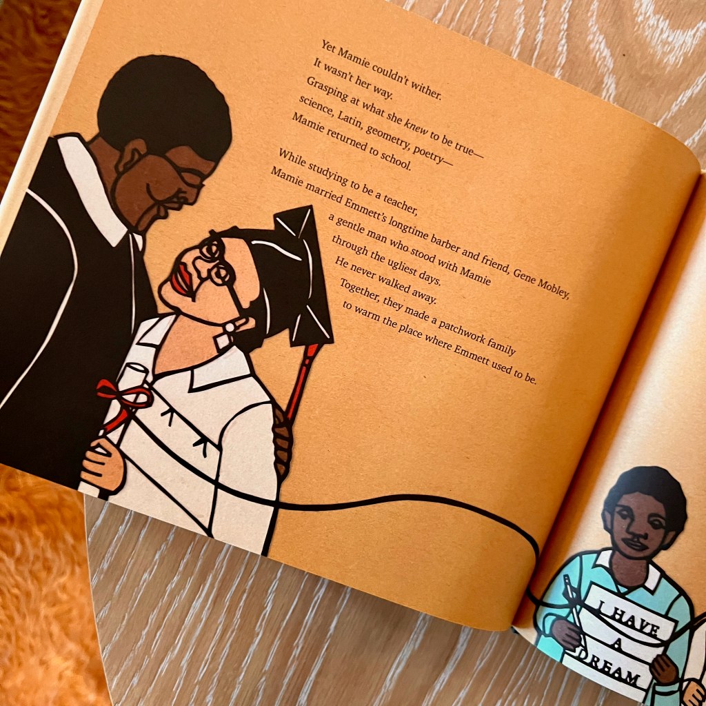 Choosing Brave could have ended there, but it doesn’t. It’s important for young readers to understand that, even though her son was taken from her, even though a trial would find Emmett’s killers innocent, Mamie would go on to channel her sorrow, her rage, her abiding love, into social justice work. She spoke at countless rallies, before going to back to school to get a teaching license so she could “help students no one else could reach.” She founded the Emmett Till Players and even found love again. She never stopped showing up for her community. And careful observers will notice the heartstring is still there.