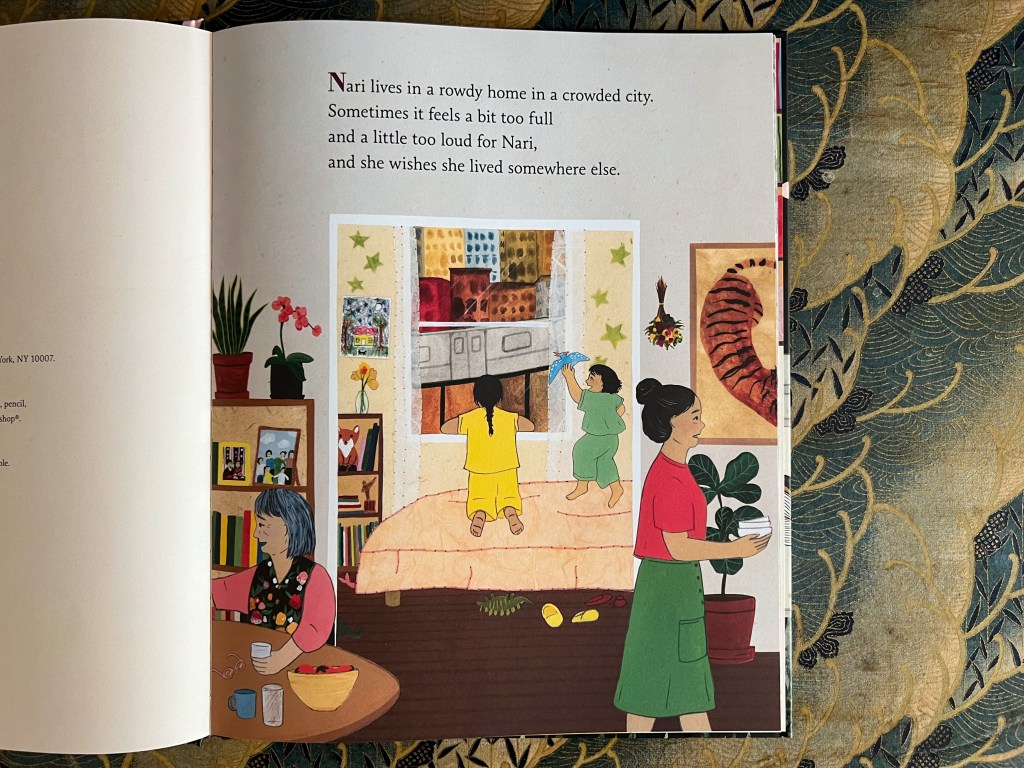 On the opening page, when we meet Nari, she’s in her apartment, a “rowdy home in a crowded city,” a place that sometimes “feels a bit too full and a little too loud for Nari, and she wishes she lived somewhere else.”