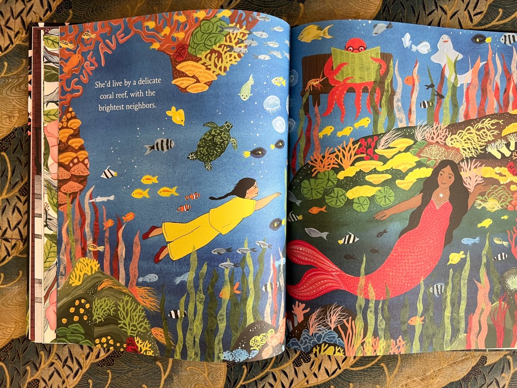 “The next stop smells of salty sea air,” as Nari takes a dip alongside sea turtles, mermaids, and octopi reading newspapers.