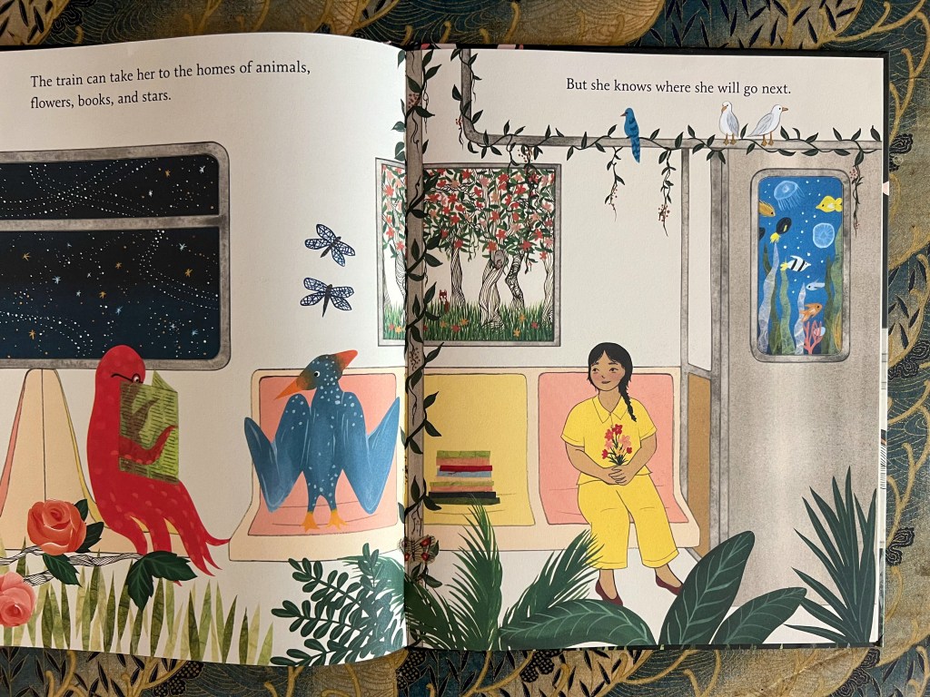 One of the final spreads is a favorite, the only time we see what the interior of Nari’s train looks like. Each of her adventures have left with her a memory, which she now transports with her into the future.
