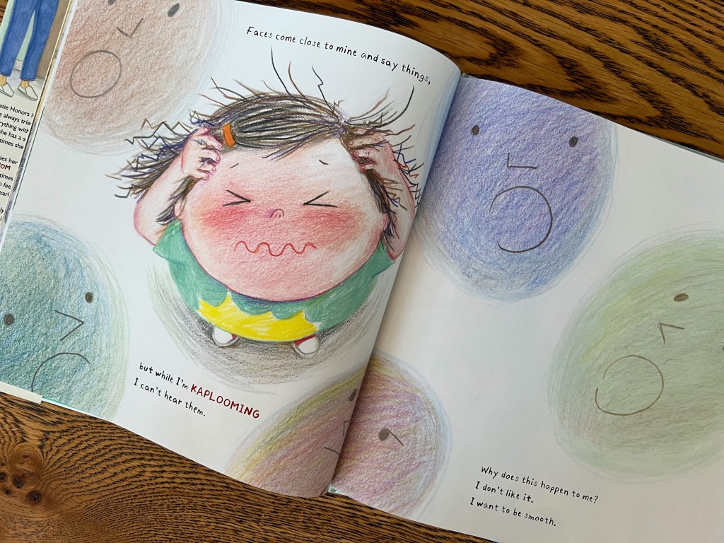 The story doesn’t shortchange this kaplooming, allowing it to play out over several pages and giving its listener valuable insight into the conflict inside Katie’s head. Katie knows that there are “faces close to mine” saying things, but she is too far gone to hear them. She wants the moment of separation from her mom to be smooth, but it feels in this moment like she’s “made of sparks.” She knows her mom is going to come back for her at the end of the school day, but she can’t concentrate on that when “everything is flurried.”