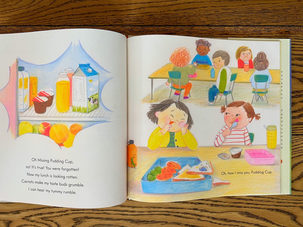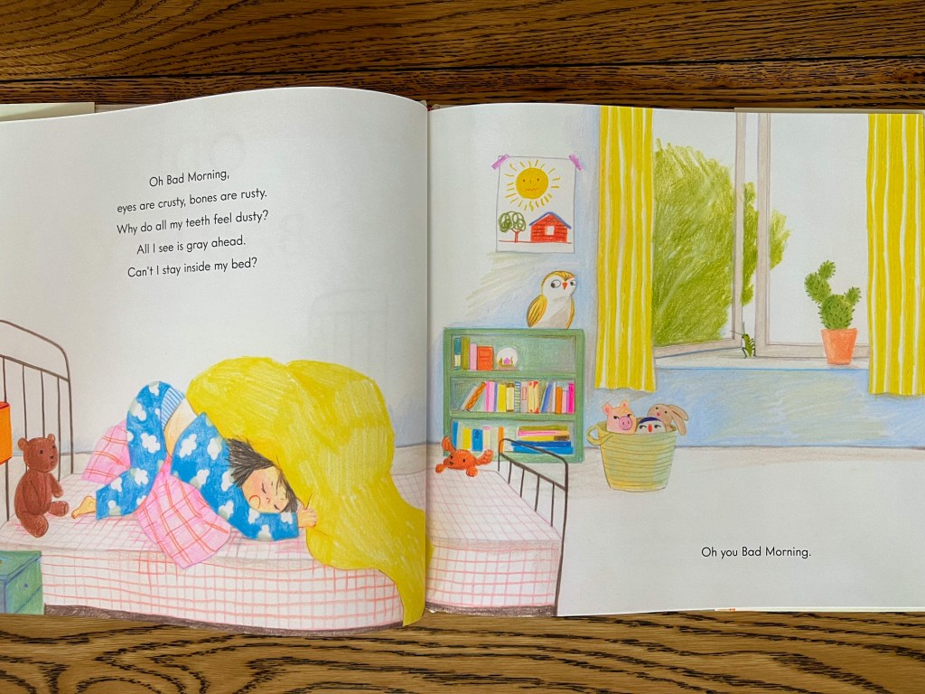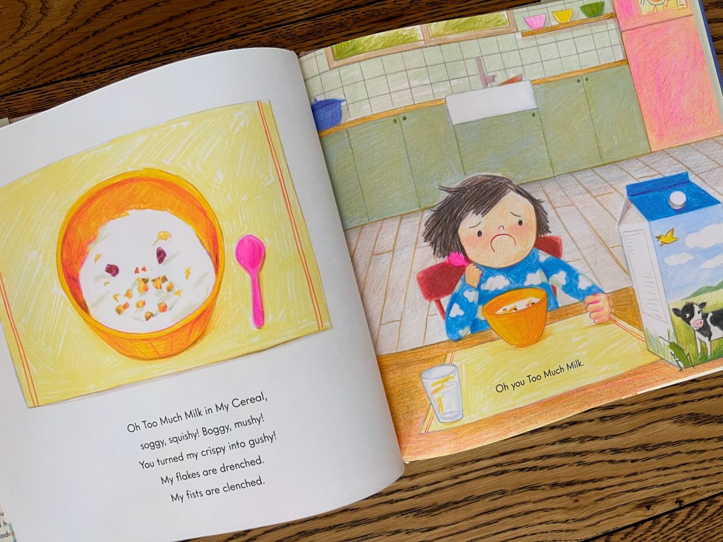 What follows is a string of complaints that will feel all-too-familiar to reader and listener alike. Soggy cereal. Stiff clothing. Being pulled down the street because everything’s a rush, rush, rush. A skinned knee. And that’s all before the school day starts.