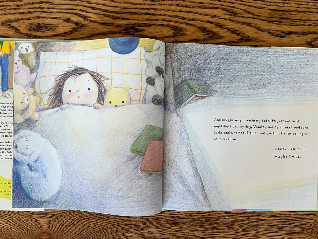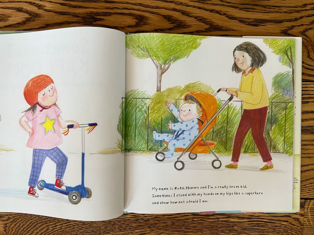 Our narrator, Katie Honors, considers herself to be a brave kid—maybe even superhero brave. She’s a big sister, a whiz on the scooter, an epic climber on the playground, and a willing tester of smelly foods. She’s even mostly fine at night “with just one small night-light.”