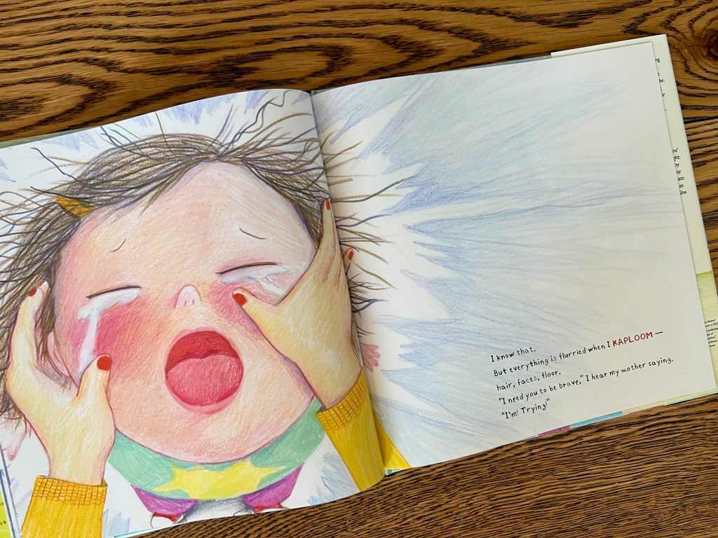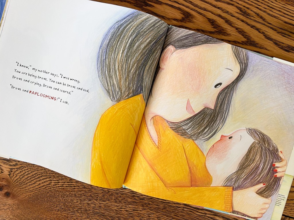 How often do we as parents casually throw around the word “brave,” inadvertently suggesting to our children that bravery and stoicism are one and the same? Here, the mother realizes her mistake and takes a minute to hold her daughter and validate the struggle inside. “I was wrong. You are being brave. You can be brave and sad. Brave and crying. Brave and scared. […] So brave, especially while you kaploom.”
