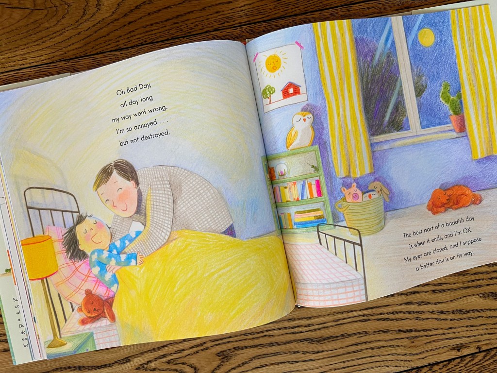 So it goes, until Dad arrives to tuck in our protagonist (who is never named as a boy or girl) and the realization comes: they’ve survived their bad day. Here’s where Ode to a Bad Day departs from Alexander, offering a glimmer of hope.