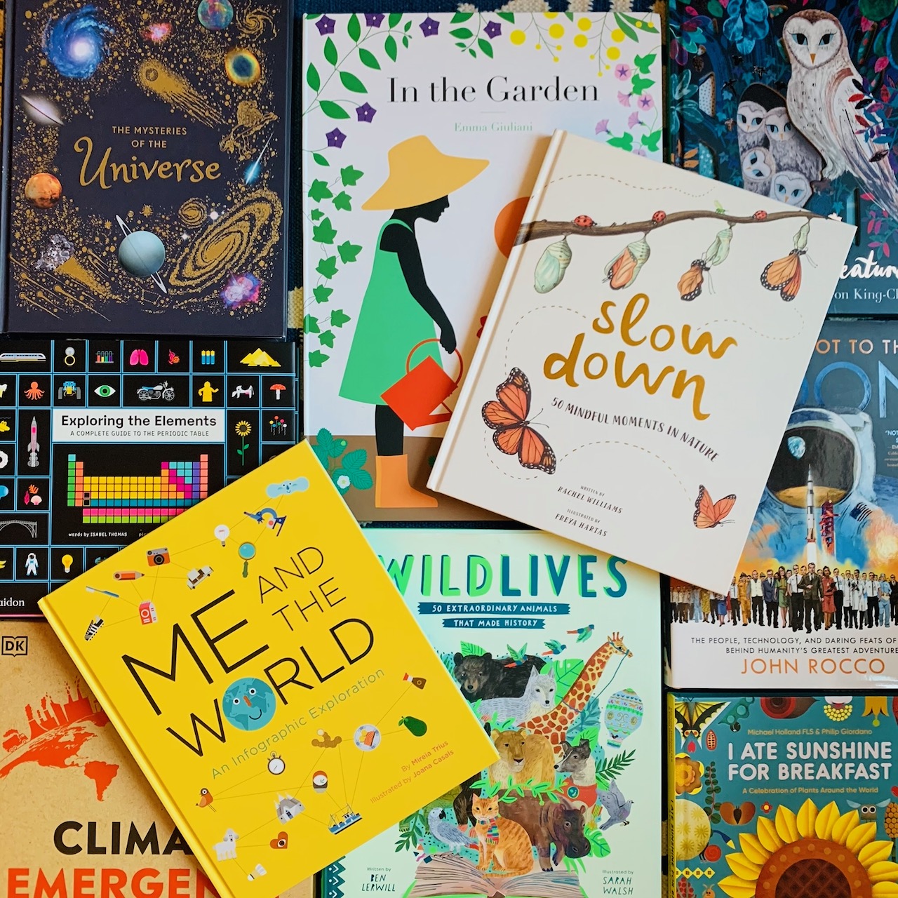 Every year on Earth Day, I smile thinking about my son at age four, who looked up at me with his big brown eyes and asked, “Mommy, aren’t we supposed to care about the Earth every day?” Yes, my boy. Same with Black history and women’s history and all the rest of these annual celebrations. But it sure is nice, now and then, to be nudged to think about our home libraries, about how we might freshen them up in a way that leads to better, richer dialogues with our children. After all, books bring with them such marvelous reminders of what a special, precious gift this planet is.